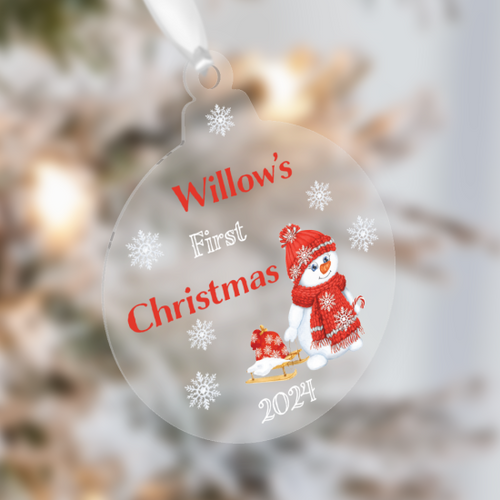 Personalised Baby’s First Christmas Bauble with Blue Snowman & Sleigh Design