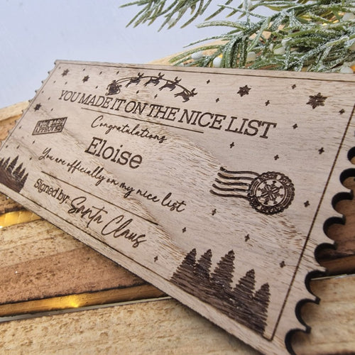 Personalised & Engraved Nice List Ticket Oak Veneer Tag
