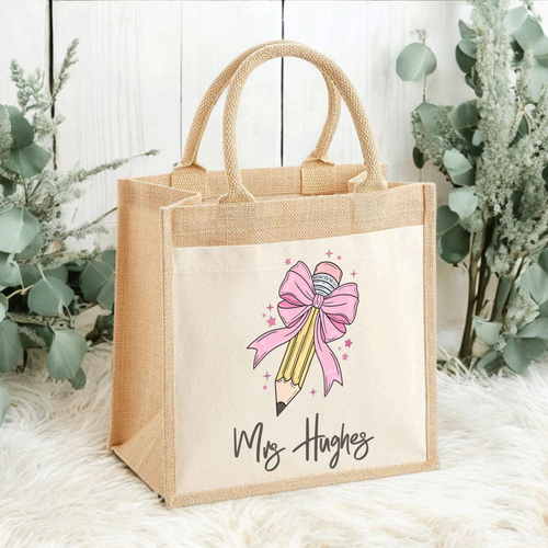 Personalised Teacher Jute Tote Bag Blush Bow Pencil