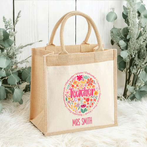 Personalised Teacher Jute Tote Bag - Floral Praise Circle